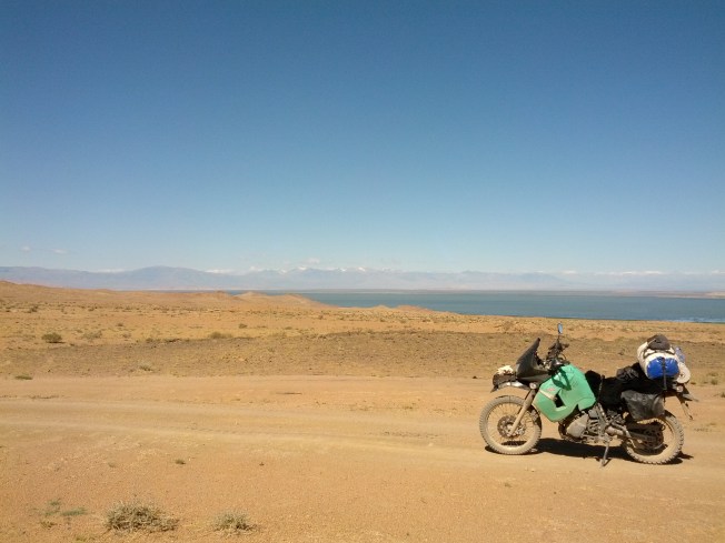 The tarmac road ran out as I turned left, taking the pass over the mountains. The road turned to small rocks, the kind that bump steer the front and rear wheels. I could see why Sara said she didn’t like it, but it was better then sand! Ken’s monoshock has leaked all the oil out, so with no dampening he must have had a hard time funding traction.
