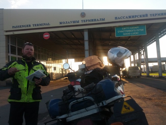 This is a bootleg photo, apologies if it’s not clear. I took it at the border crossing from Kazakhstan back to Russia. I liked the fact that even at the border there’s a sign that says “Good luck”.