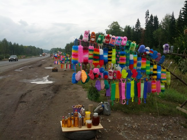I knew it wasn’t the main route but I wasn’t worried, the signs were pointing me towards Kazan – which is where I was heading. I came across some roadside stalls selling what looked like knitted garments. I stopped for a look and it was all men doing the work, which I thought was a bit strange. I asked one of them what the scarf like items with two handles were. He took one down to show me.