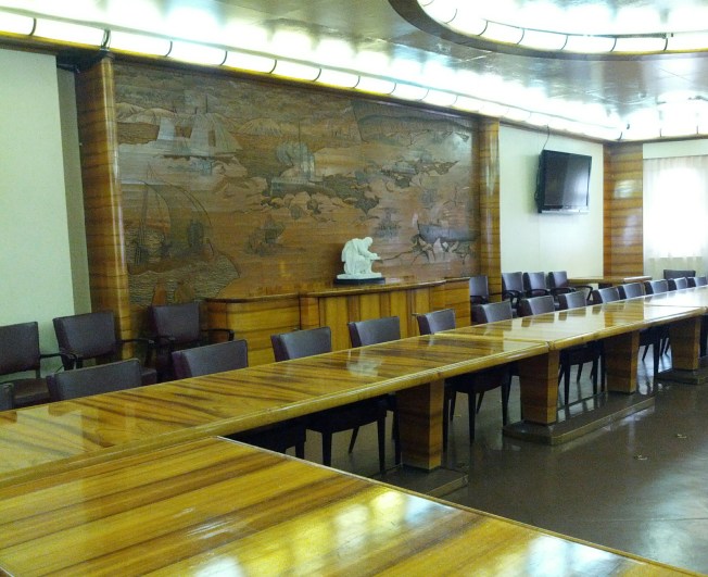 Pictured is the officers board room, with Karelian birch paneling and a 50 year old ‘bird’s eye’ maple table. (My banjo’s made of that!). The crew mess was a little plainer, but it had some great artwork. I also liked the crew tables where you could raise the edges. This was in order to keep your dinner plate on the table in rough seas!