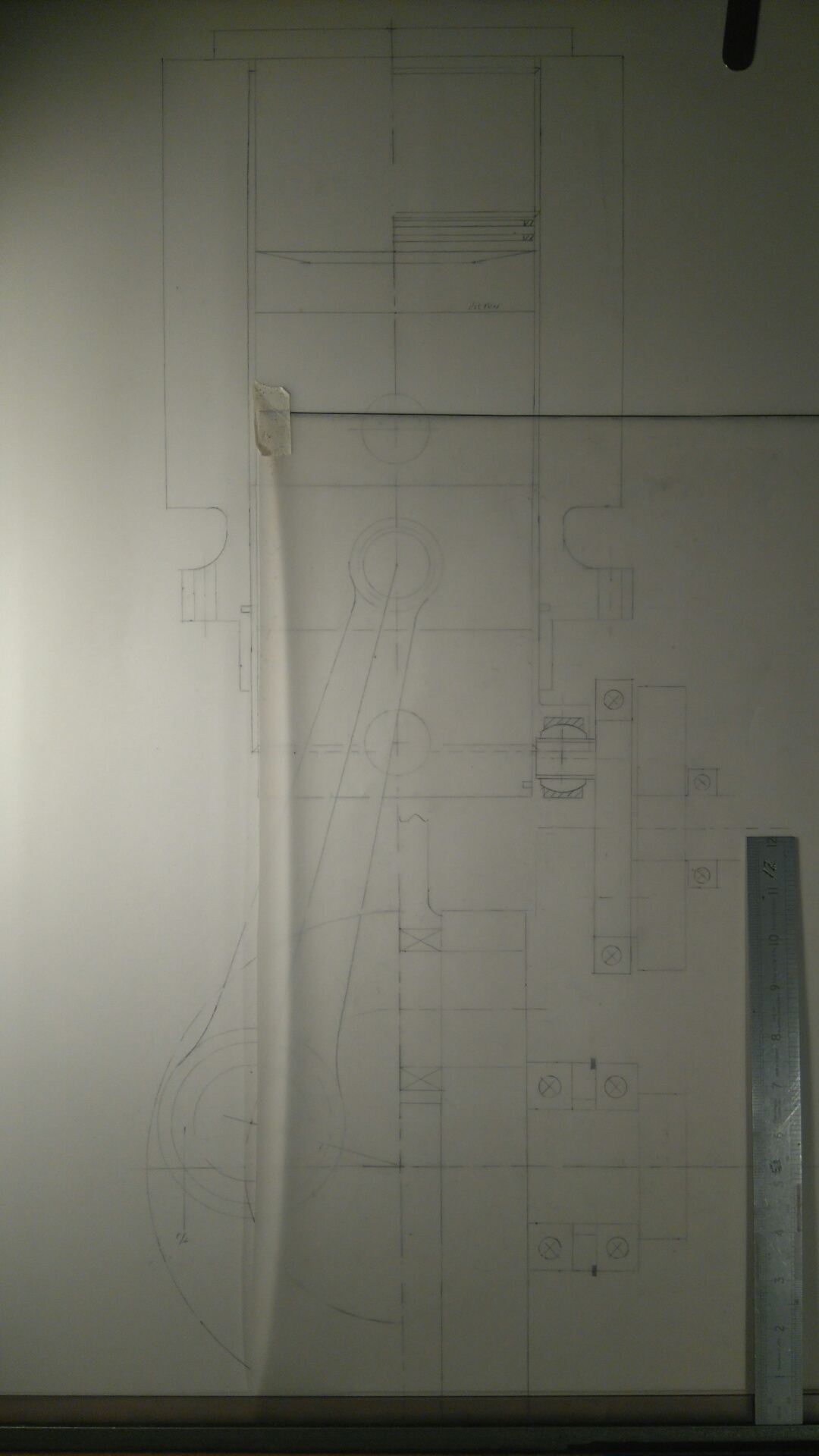 It might not look much, but a lot of thought and calculations have gone into producing this drawing. Bob has been hard at work putting the base dimensions together, working out the minimum rod length we can get away with to make a compact engine.