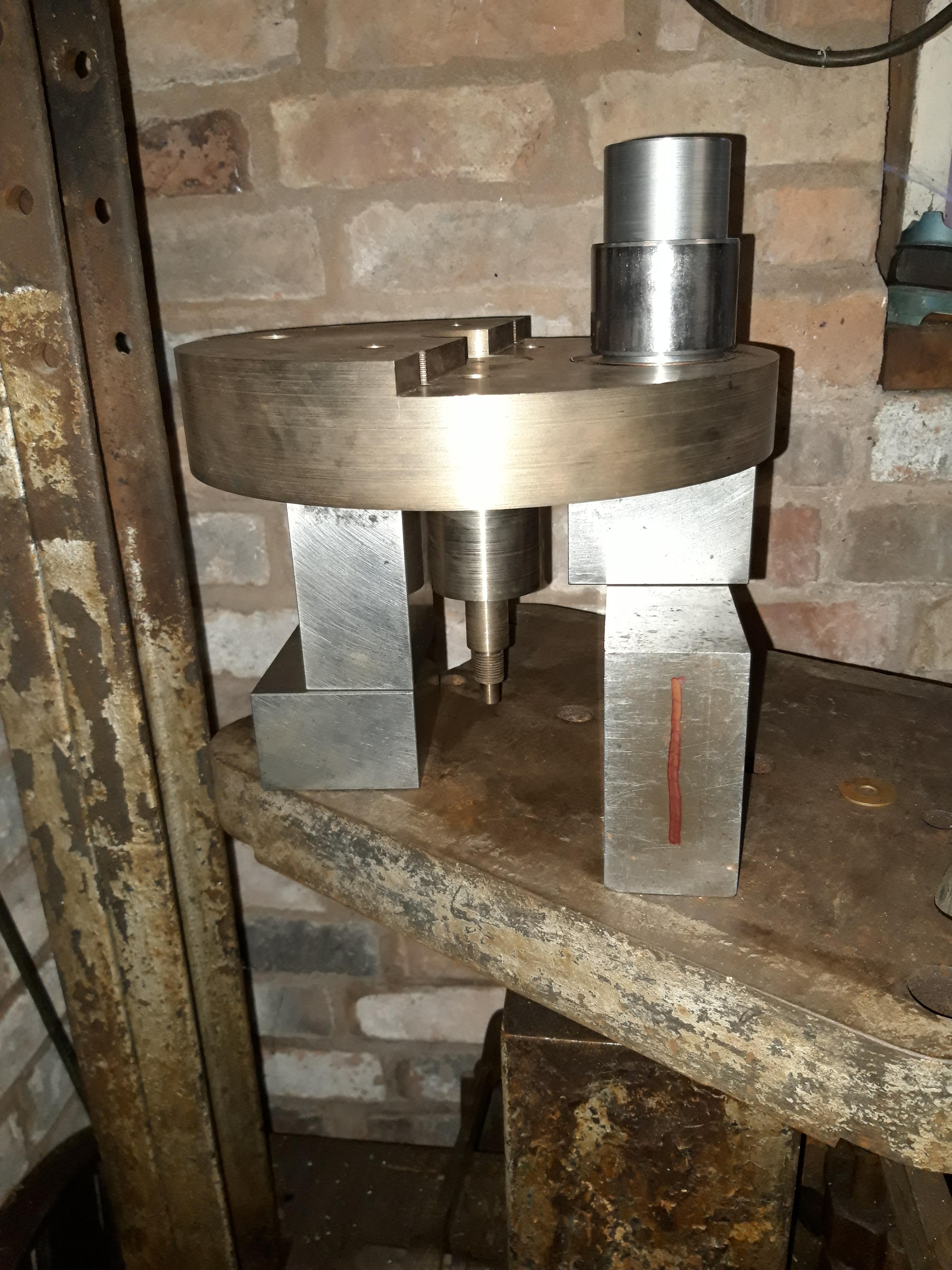 High hopes this morning when a friend set me up with access to a 30 Tonne press. There’s a lot of weight in the flywheel assembly now but I duly carried it to the car and set off for Rugby.