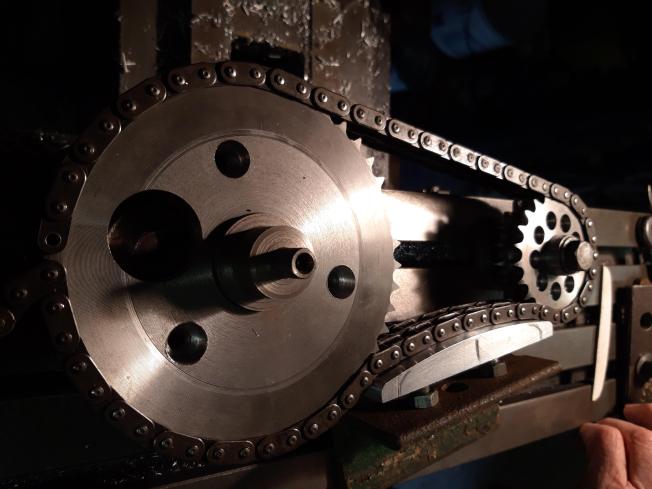 Here’s the final sleeve drive assembly, complete with chain tensioner in situ. The distance between centres is as drawn, with the adjuster fully in to give the full travel as the chain wears. Shown in the orientation it will take in the engine on final assembly.