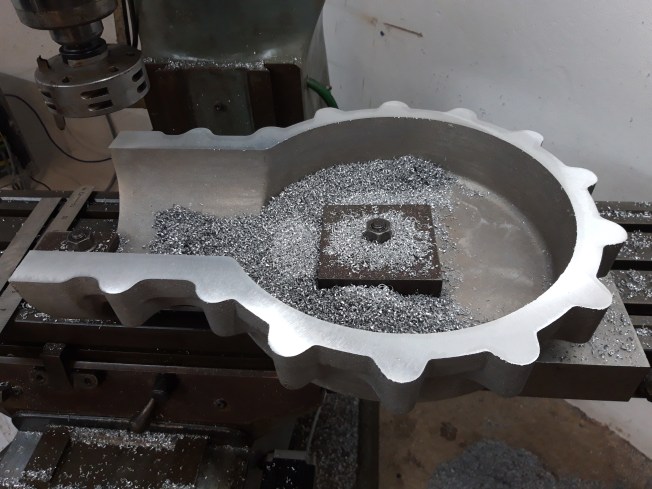 The drive side case was first up for fly cutting the mating surface. Bob mounted it to the table and did the faffing about getting it level, but in fairness the casting was pretty straight. I did a dry run of the tool path and when that was complete there was no delaying it. Time for the first cut!