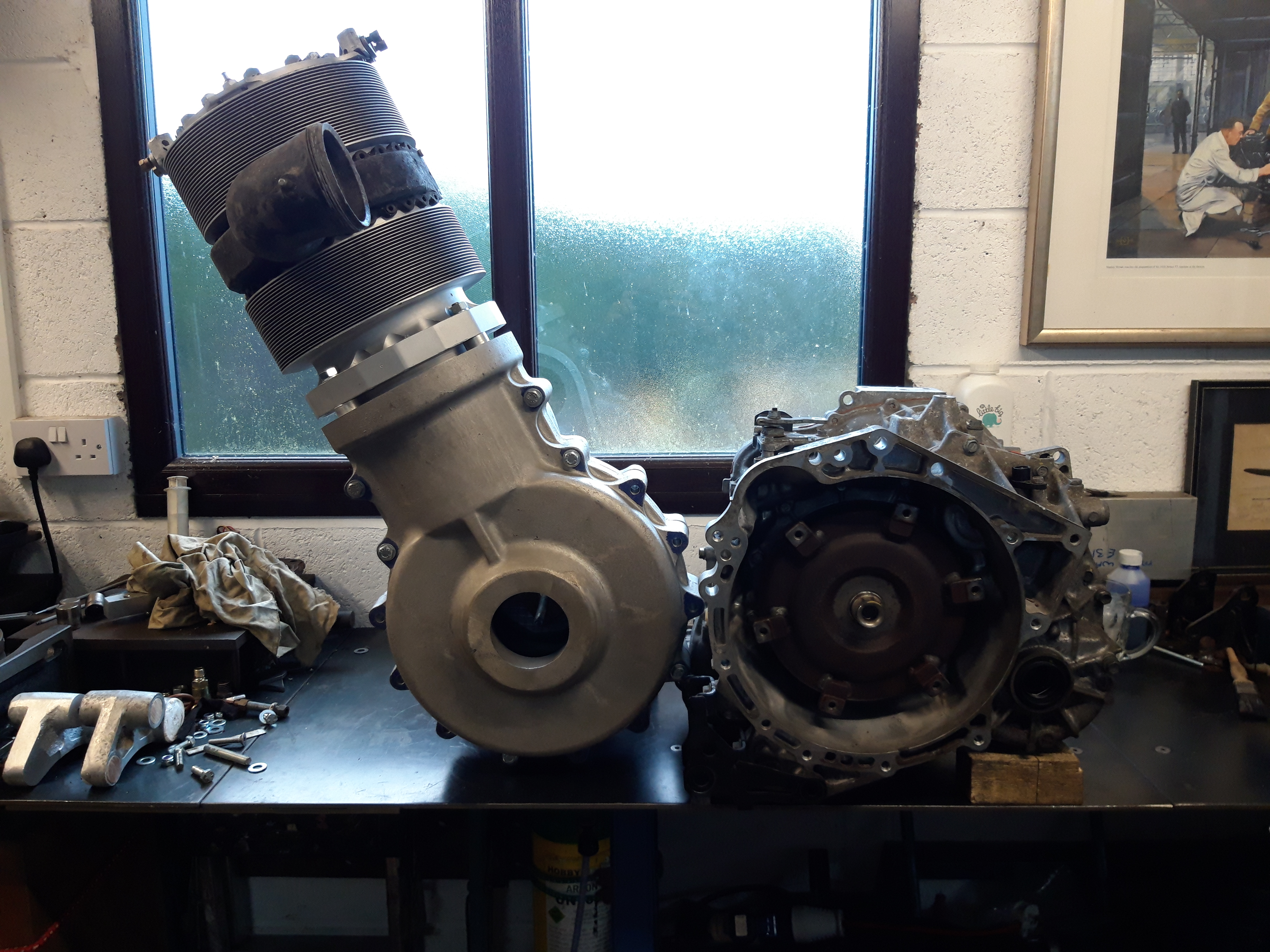 The gearbox from the Toyota is next to the engine in the photo, and they don’t look too bad together. A fluid flywheel, cvt and differential would make for an interesting transmission, but unfortunately the flywheel rotates the other way on the car which adds complications.